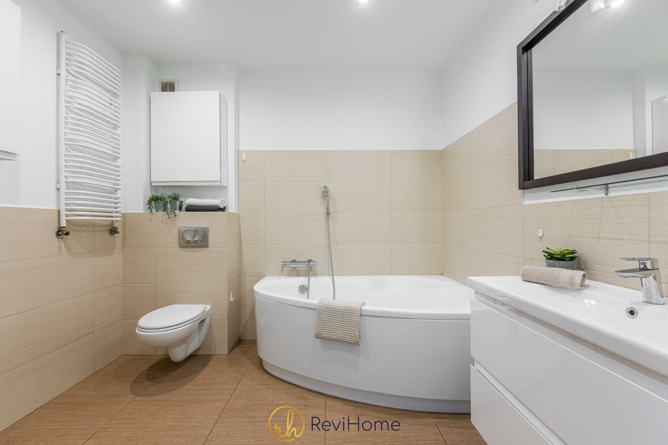 W mieszkaniu znajdują się również pralka, suszarka oraz nowa klimatyzacja. Dwie szafy w zabudowie zapewniają mnóstwo miejsca do przechowywania.